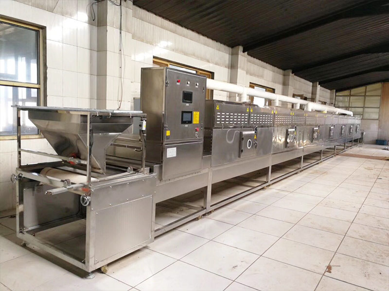 在實際工作中,微波干燥殺菌設(shè)備主要用在低水分物料的干燥(含水率30%以下)中。此時,傳統(tǒng)的干燥方法(熱風(fēng)、電烘爐)干燥速率低、耗能大,而隧道式微波干燥設(shè)備從進料到出料中需3-5分鐘時間即可完成干燥。傳統(tǒng)方法配套設(shè)備多,占地面積大,用人多,常有污染,消防等問題。